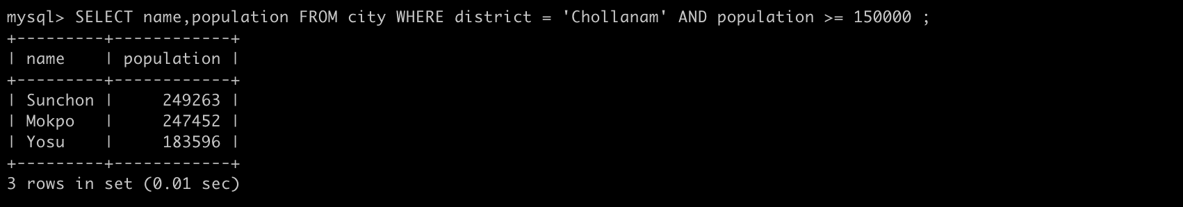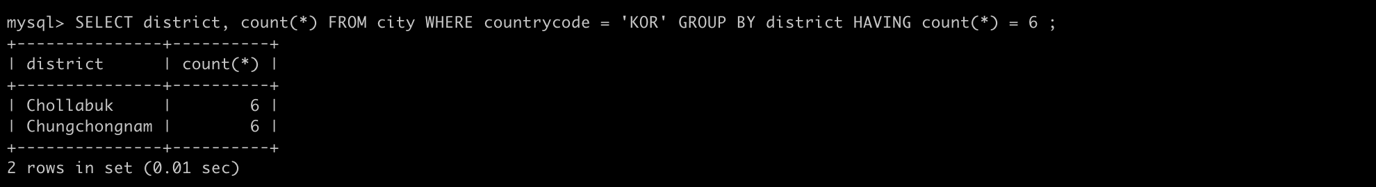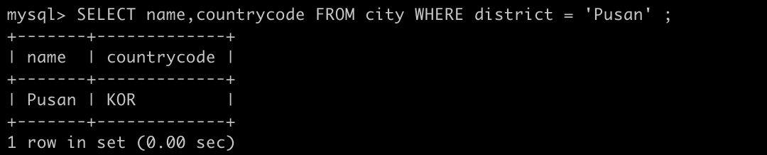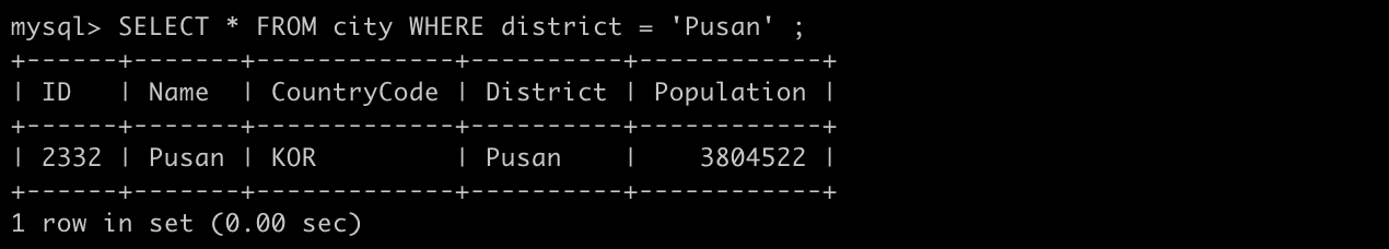 mysql> SELECT * FROM city WHERE district = 'Pusan' ;