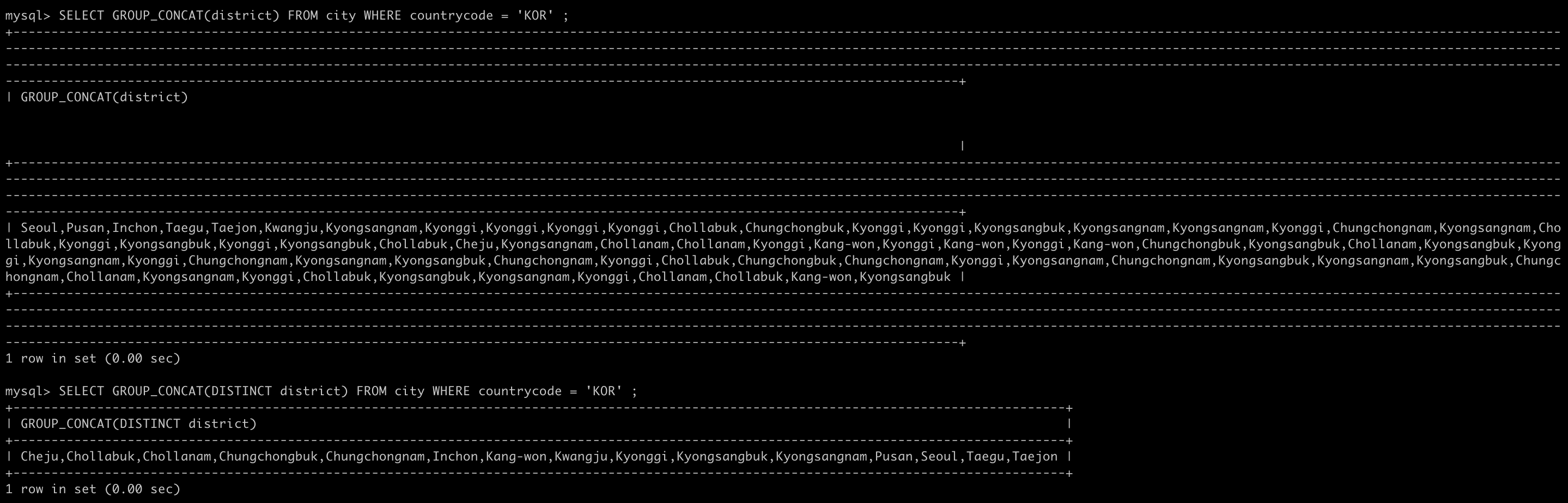 캡쳐에서 위는 DISTINCT 키워드를 쓰지 않아서 전부 합쳐서 나온 모습이고, 밑은 district 가 중복을 제외하고 하나씩 나온 모습!