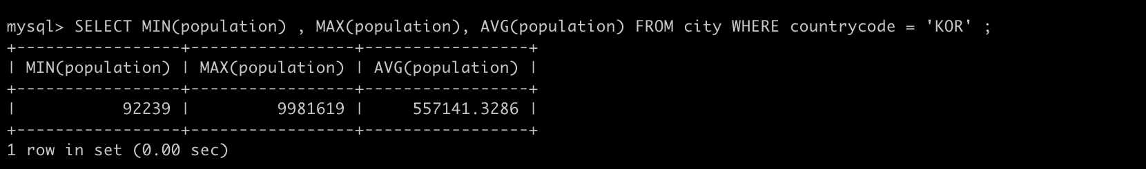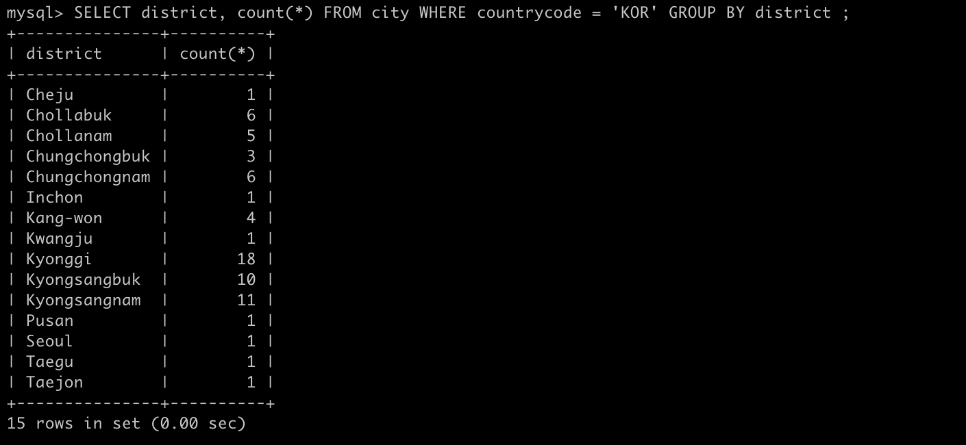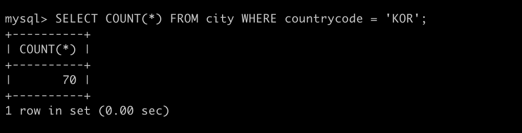 mysql> SELECT * FROM city WHERE countrycode='KOR';