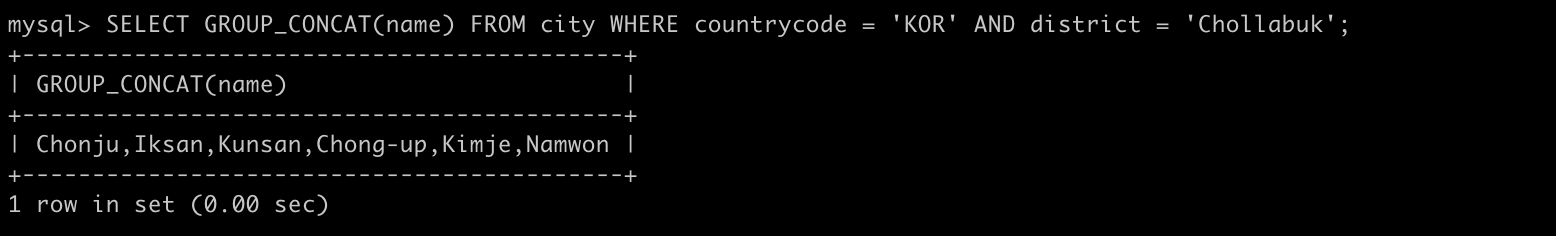 /* countrycode 가 'KOR' 이고, district 가 'Chollabuk' 인 데이터를 한 행에 모아서(GROUP_CONCAT) name 을 보여줘. */